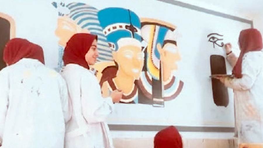 مُعلمة تجسد رسومات للشخصيات النسائية على جدران مدرستها