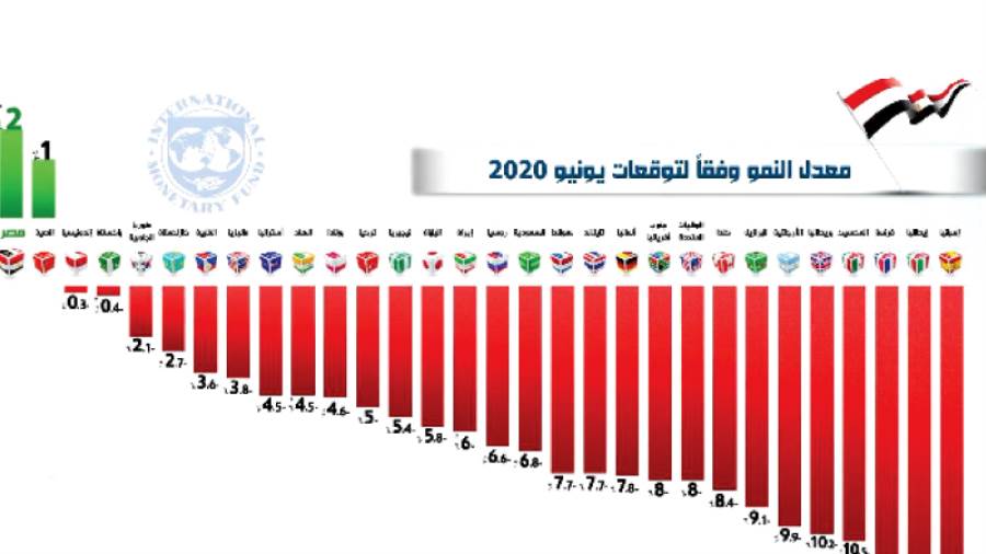 ووفقا لتوقعات الصندوق لمعدلات النمو فى يونيو 2020، فإن مصر تأتى فى المرتبة الأولى فى القائمة بمعدل نمو 2%، تليها الصين بمعدل نمو 1%، بينما انكمش الناتج المحلى الإجمالى لإندونيسيا بنسبة 0.3%، تليها باكستان بمعدل انكماش 0.4%، ثم كوريا الجنوبية بمعدل انكماش 2.1%، وكازخستان بمعدل انكماش 2.7%، والفلبين بمعدل انكماش 3.6%، وماليزيا بمعدل انكماش 3.8%، كما انكمش الناتج المحلى الإجمالى لكل من استراليا والهند بمعدل انكماش 4.5% لكل منها، وكذلك انكمش الناتج المحلى لبولندا بمعدل 4.6%، وتركيا بمعدل 5%.
