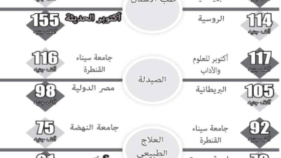 شهدت كليات القمة بالجامعات الخاصة، فى تنسيق العام الدراسى الجديد 2020-2021، ارتفاعًا كبيرا فى الرسوم الدراسية، خاصة للكليات العملية والقمة، ونوعت عدد من الجامعات فى الرسوم الدراسية وفقا لشرائح المجاميع، حيث تربعت كلية الطب على مصاف الكلية الأعلى فى الرسوم الدراسية، وتراوحت مصروفات كليات الطب بين 85 إلى 195 ألف جنيه، تلتها كلية طب الفم والأسنان، والصيدلة، والعلاج الطبيعى، والهندسة.