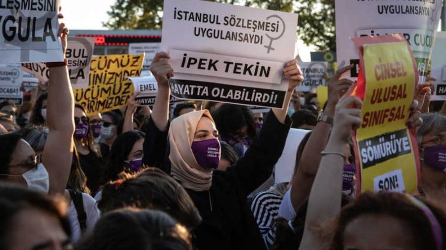 الغريب انه وسط الغضب من تصاعد العنف ضد النساء، بدأ حزب العدالة والتنمية الحاكم فى إجراءات الانسحاب من اتفاقية مجلس أوروبا (اتفاقية إسطنبول) بشأن مكافحة العنف ضد المرأة، وقال أردوغان إن الاتفاقية لا تتماشى مع «قيم المجتمع التركي» وبالتالى لا ينبغى اعتبارها ملزمة!.