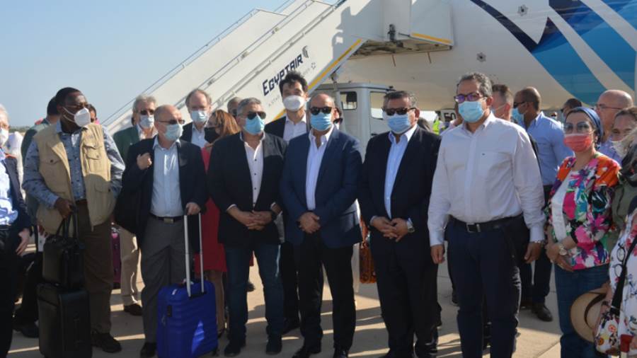 كما قام منار والدكتور خالد العنانى وزير السياحة والآثار والدكتورة ياسمين فؤاد وزيرة البيئة، والدكتور أسامة هيكل وزير الدولة للإعلام والطيار منتصر مناع نائب وزير الطيران بجولة موسعة بمطار شرم الشيخ الدولى يرافقهم عدد 30 من سفراء الدول الأجنبية للتعرف على الإجراءات الإحترازية والتدابير الوقائية المطبقة بالمطار للحد من فيروس كورونا المستجد، وذلك بحضور السفير الدكتور بدر عبدالعاطى مساعد وزير الخارجية للشئون الأوروبية وباسم عبد الكريم مساعد وزير الطيران للشئون الدولية والإعلام، وكان فى استقبالهم اللواء خالد فودة محافظ جنوب سيناء واللواء خالد عبد السلام مدير المطار.