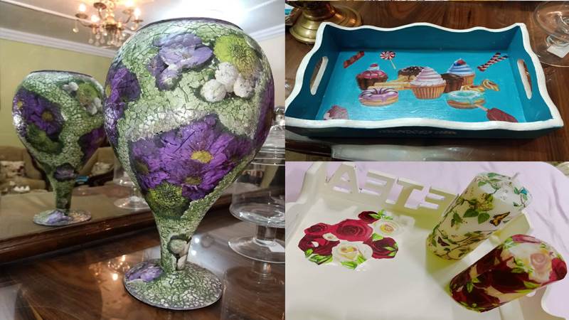 تقول عزة لـ«روزاليوسف» لم اتعلم ولم أتلق أى كورسات فنية لكنى أعشق الهاند ميد فهو مجرد هواية واعتمدت على شرح أساتذة جيدين على الفيس بوك لم يبخلوا بأى معلومة، لكنى تفننت فى استخدام قشر البيض المقلى بعد غسله وتجفيفه أما قشر المسلوق يكون له رائحة غير جيدة، وقد وجدت تشجيعاً من كل من حولى سواء أسرتى وأصدقائى ومعارفي، وبجانب الديكوباج على الخشب والزجاج أقوم بعمل الاستنسل البارز واتعلم حالياً التعتيق الروسى.