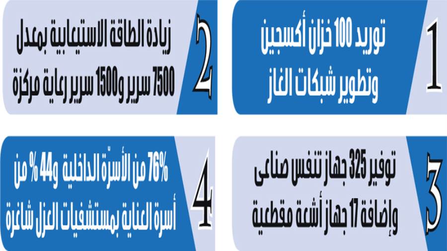 وفى سياق متصل، استعرضت «زايد»، استعدادات الوزارة لمواجهة الموجة الثانية لفيروس «كورونا»، وذلك من خلال تطوير البنية التحتية لـ 44 من مستشفيات الحميات والصدر، وتوريد 100 خزان أكسجين، وتطوير شبكات الغاز، فضلا عن زيادة الطاقة الاستيعابية بمعدل 7500 سرير، و1500 سرير رعاية مركزة، و325 جهاز تنفس صناعي، وإضافة 17 جهاز أشعة مقطعية، كما عرضت إجراءات الوزارة لزيادة وتوفير الأكسجين الطبى بالمستشفيات.