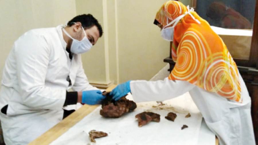 فى هذه الفترة كنت أنا وولاء وإيمان فقط واستغرق العمل فى الفحص وإعداد تقارير الحالة سنة و8 شهور، منها سنة كنت بمفردى، وهذه المدة بدأت اول عام 2017، وخلالها كنا فقط نجرى دراسة على ال 22 مومياء لإعداد تقارير الحالة فقط والتى بناء عليها تم إعداد خطة الترميم والنقل، واستعنت بإيمان وولاء لأنهما قويتان فى تخصصهما وهو ما كانت تتطلبه المعلومات التى نسعى لها لتكون بمنتهى الدقة، والمومياوات منها 18كانت معروضة و4 مومياوات فى المخازن ستعرض لأول مرة، وتقارير الحالة كنا نعدها لكل المومياوات سواء المعروضة أو المخزنة وهى مسألة صعبة جدا، خاصة أنه فى 1881 اكتشفوا خبيئة المومياوات وبعضها كانت منزوعا منها الأجزاء الذهبية ومقطوعا معها أجزاء من الجسم.