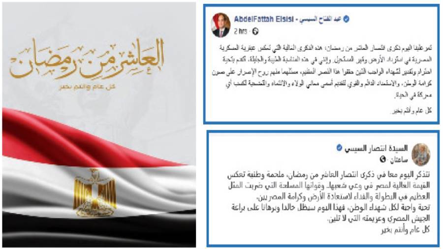 هنأ الرئيس عبدالفتاح السيسى، الشعب المصرى، بذكرى انتصار العاشر من رمضان، حيث كتب على صفحته الرسمية على موقع التواصل الاجتماعى «فيس بوك»: «تمرعلينا ذكرى انتصار العاشر من رمضان؛ هذه الذكرى الغالية التى تعكس عبقرية العسكرية المصرية فى استرداد الأرض وقهر المستحيل».