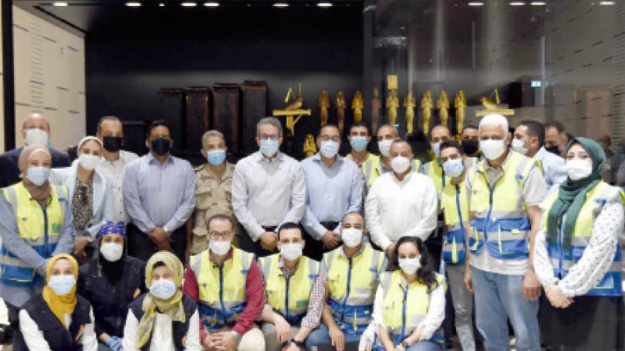 من جانبه، استعرض المشرف على مشروع المتحف، إلى الموقف التنفيذى للأعمال الهندسية لمبنى المتحف، مشيرًا إلى أنه تم الانتهاء من الهيكل الإنشائى بنسبة 100%، كما أنه جار الانتهاء من التشطيبات الداخلية، وواجهة الأهرامات، والأرضيات والساحات الخارجية والزراعات، إلى جانب قرب الانتهاء من تركيب أنظمة الإلكتروميكانيك، وأنظمة الاتصالات الذكية والتأمين، لافتًا إلى أنه يتم تعقيم المتحف بصورة يومية وسط اجراءات احترازية كاملة يخضع لها كل من يعمل فى هذا المشروع فى مجال الإنشاءات والترميم.