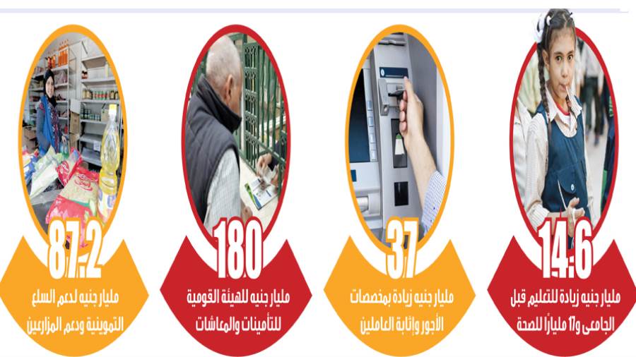 كشف تقرير لوزارة المالية عن تقرير حزمة استثنائية من البرامج الاجتماعية لتخفيف عبء الإصلاح على المواطنين، فمثلًا تم زيادة مخصصات التعليم قبل الجامعى للعام المالى الحالى بقيمة ١٤,٦ مليار جنيه لتصل إلى ٢٥٦ مليار جنيه، وقد تم تخصيص ٢,٥ مليار لزيادة حافز تطوير المعلمين بالتعليم العام والأزهر للمراحل السنية من رياض الأطفال إلى الصف الرابع الابتدائى بصافى استفادة للمعلم تصل إلى نحو ٥٥٠ جنيهًا شهريًا، وزيادة بدل المعلم وحافز الأداء ومكافآت امتحانات النقل بتكلفة قدرها ٥,٦ مليار جنيه سنوياً بموازنة العام المالى ٢٠٢١/ ٢٠٢٢، ولقطاع التعليم العالى والجامعى تم إقرار زيادة بمخصصاته بنحو ١٠ مليارات جنيه لتصل إلى ١٣٢ مليار جنيه إضافة إلى زيادة بنحو ٤ مليارات بمخصصات البحث العلمى لتصل إلى ٦٤ مليار جنيه.