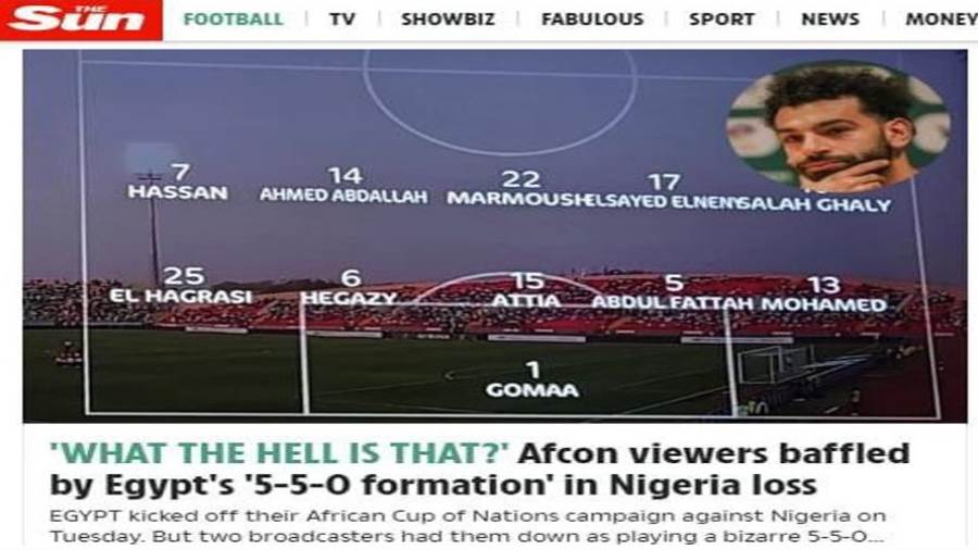 ودفع الأداء الكارثى للفراعنة أمام نيجيريا صحيفة «ذا صن» البريطانية للتعليق على طريقة لعب المنتخب الوطنى .. وأعدت الصحيفة تقريرا بعنوان «ما هذا بحق الجحيم؟»، حيث كتبت «طريقة لعب منتخب مصر، حيرت مشاهدى كأس الأمم الإفريقية بسبب طريقة ( 5-5-0) التى لم يسبق لها مثيل ضد نيجيريا فى المباراة الافتتاحية لصلاح وشركاه. وأضافت الصحيفة: «كان كل شىء على ما يرام مع تغطية ما قبل المباراة، حتى أظهرت تشكيل منتخب