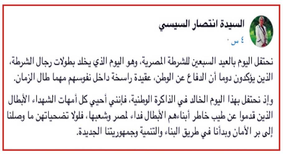 وكتبت السيدة انتصار السيسى عبر حسابها الرسمى بموقع التواصل الاجتماعى «فيس بوك»: «نحتفل اليوم بالعيد السبعين للشرطة المصرية، وهو اليوم الذى يخلد بطولات رجال الشرطة، الذين يؤكدون دومًا أن الدفاع عن الوطن، عقيدة راسخة داخل نفوسهم مهما طال الزمان».
