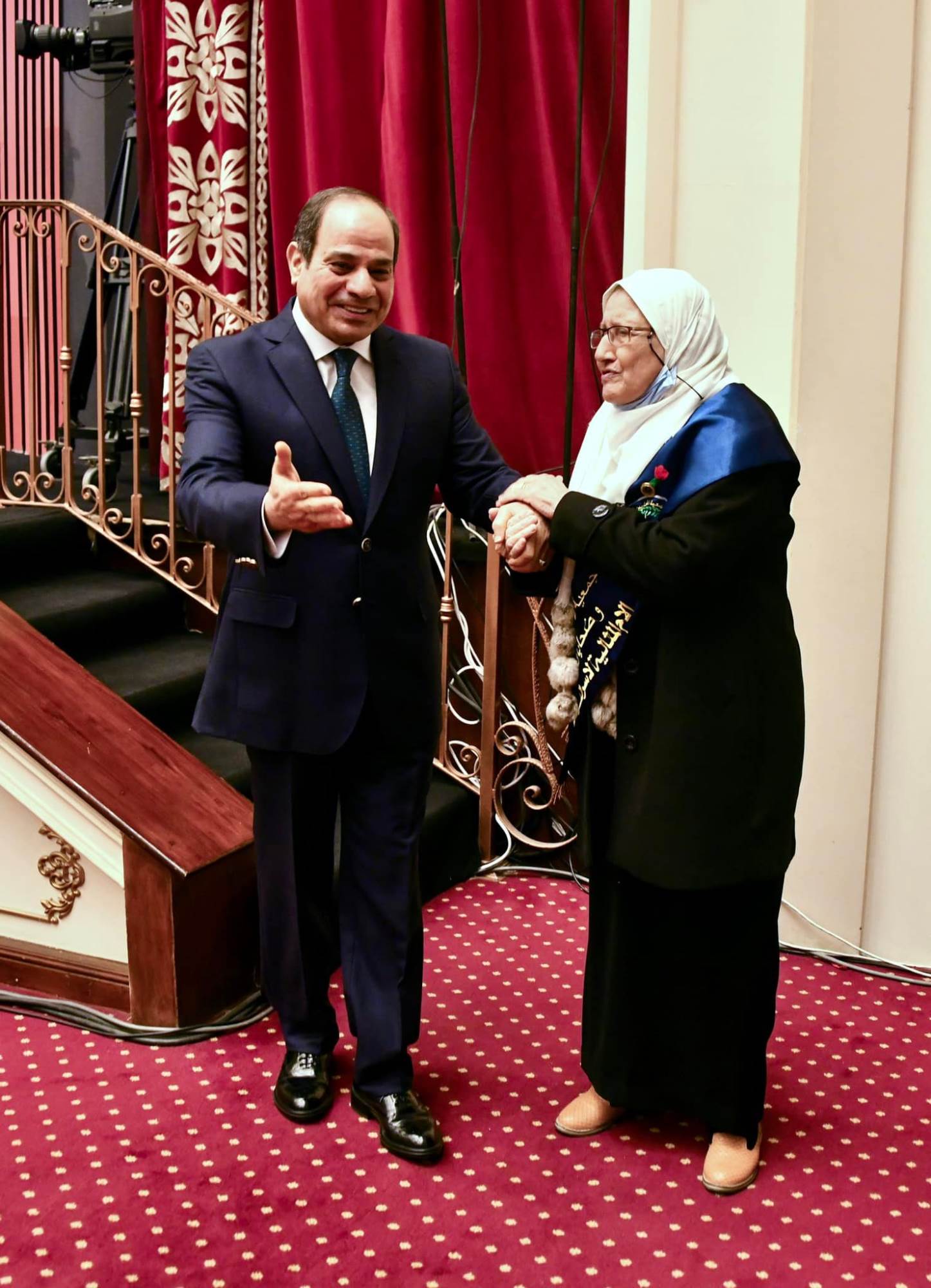 وتبادل الرئيس أطراف الحديث مع ذوى الشهداء المكرمين، وفى لفتة إنسانية حرص الرئيس على اصطحاب «الأم المثالية» وسار معها متكئة على يديه حتى أنزلها من سلم منصة التكريم.