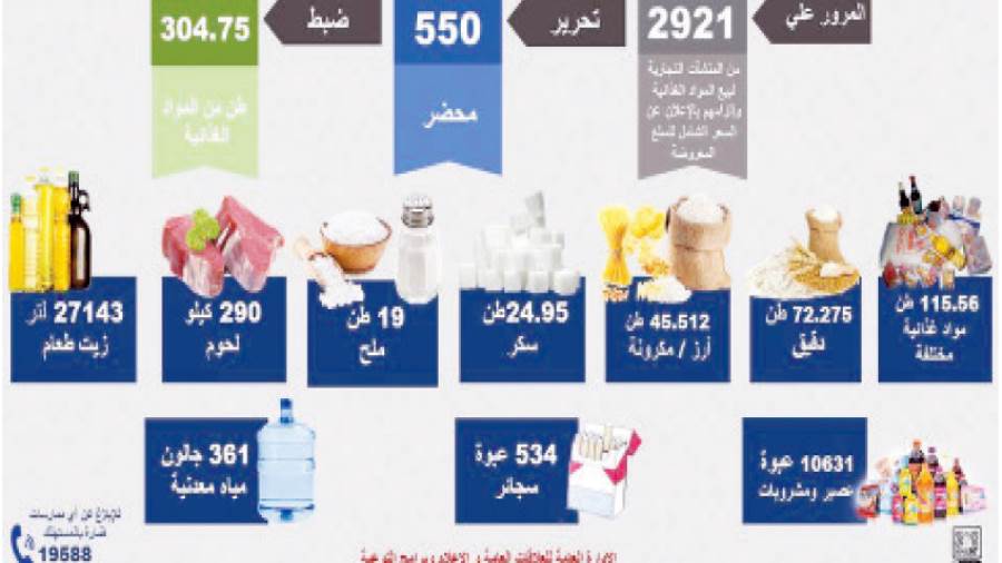 أعلن جهاز حماية المستهلك عن تكثيف الرقابة على الأسواق وشن حملات رقابية على 2921 منشأة تجارية لبيع المواد الغذائية وإلزامها بالإعلان عن السعر الشامل للسلع المعروضة، وذلك على مدار 4 أيام فى الفترة من 14 إلى 18 مارس الجارى، وتم تحرير 550 مخالفة طرح منتجات غير صالحة للاستهلاك الآدمى وأيضا احتكار السلع والتلاعب فى الأسعار.