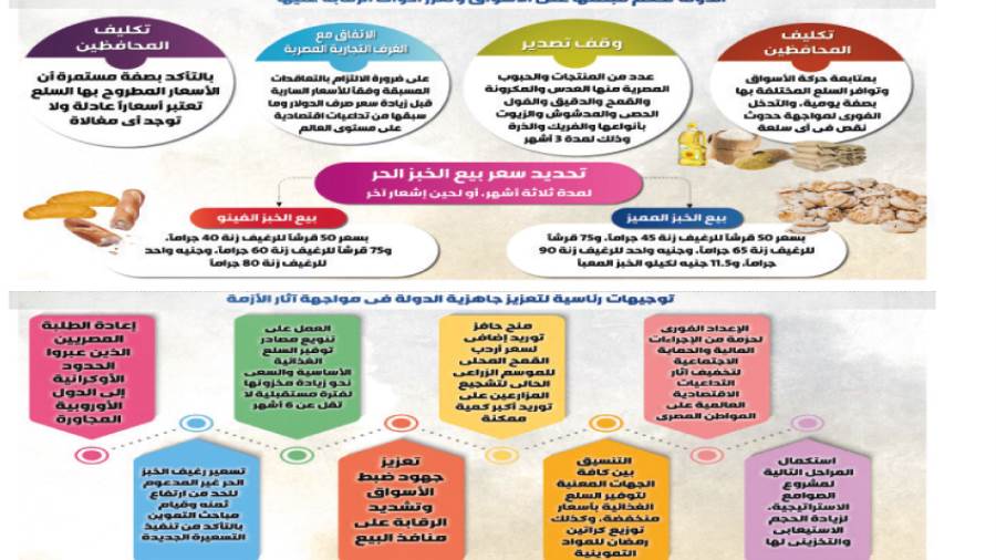 كما تتضمن التوجيهات، استكمال المراحل التالية لمشروع الصوامع الاستراتيجية، لزيادة الحجم الاستيعابى والتخزينى لها، وأيضًا التنسيق بين كافة الجهات المعنية، لتوفير السلع الغذائية بأسعار منخفضة، وكذلك توزيع كراتين رمضان للمواد التموينية، فضلًا عن تعزيز جهود ضبط الأسواق وتشديد الرقابة على منافذ البيع.. وتشمل التوجيهات الرئاسية أيضًا، وفقًا للتقرير، تسعير رغيف الخبز الحر غير المدعوم للحد من ارتفاع ثمنه وقيام مباحث التموين بالتأكد من تنفيذ التسعيرة الجديدة، علاوة على إعادة الطلبة المصريين الذين عبروا الحدود الأوكرانية إلى الدول الأوروبية المجاورة.