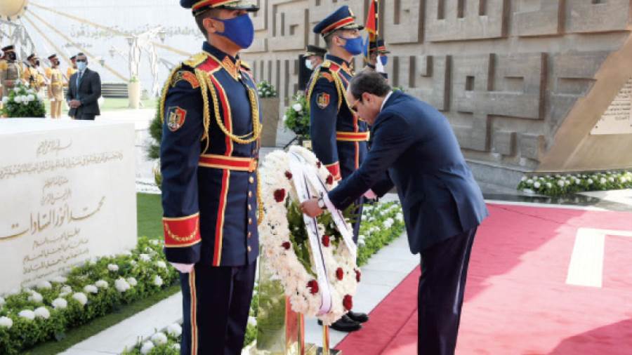 ثم توجه الرئيس إلى قبر الرئيس الراحل محمد أنور السادات، وقام بوضع إكليل من الزهور وقراءة الفاتحة ترحمًا على روحه الطاهرة.