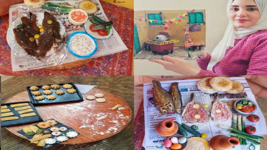 تحرص الأسر المصرية كل عام على إعداد أنواع مختلفة من الاطعمة فى المناسبات المختلفة، ففى شهر رمضان تمتلئ مائدة الطعام بالطيور والمحاشى والملوخية والخضروات، وفى شم النسيم تعد الرنجة والفسيخ وجبة أساسية، أما عيد الفطر فلا يمكن الاستغناء عن الكحك والبسكويت والبيتيفور، لذا قامت مصممة الهاند ميد هبة عتمان، بتحويل كل هذه الأطعمة والحلويات إلى مصغرات أكل صغيرة مصنوعة من الصلصال الحرارى وعجينة السيراميك حتى أن كل من يراها من بعيد يعتقد أنها أطعمة حقيقية.