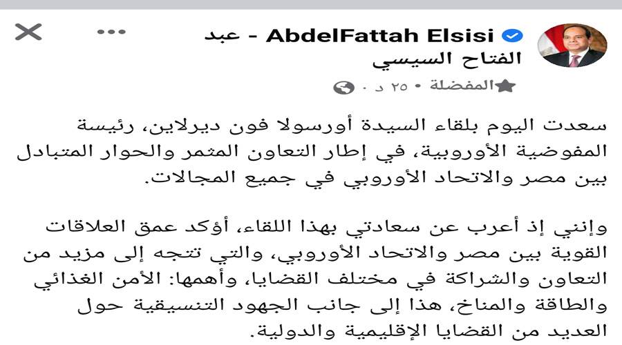 جاء ذلك فى بيان مشترك صدر عقب اجتماعها الرئيس عبدالفتاح السيسى مع فون دير لاين.