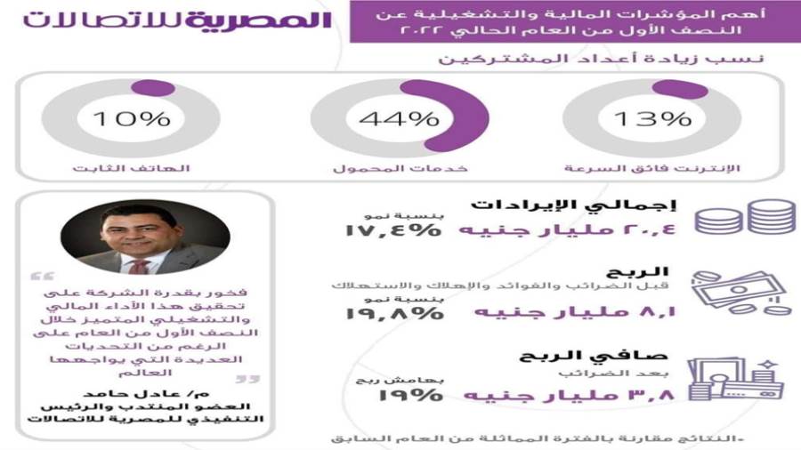 وقد علق المهندس عادل حامد، العضو المنتدب والرئيس التنفيذى للشركة المصرية للاتصالات على نتائج أعمال الشركة عن النصف الأول من العام 2022 قائلاً: «فخور بقدرة الشركة على تحقيق هذا الأداء المالى والتشغيلى المتميز خلال النصف الأول من العام على الرغم من التحديات العديدة التى يواجهها العالم كتغير أسعار صرف العملات والتضخم والضغوط الناجمة من مشكلات الاستيراد، حيث أظهرت الشركة نموا على مستوى كافة وحدات الأعمال، وحقق إجمالى الإيرادات خلال النصف الأول من العام نموا قدره 17% مقارنة بنفس الفترة من العام السابق مدعوما بالأداء المتميز لوحدات أعمال التجزئة مع استمرار ارتفاع إيرادات البيانات كمحرك رئيس لهذا النمو بنسبة وصلت 52%. علاوة على ذلك مازلنا قادرين على تحقيق هوامش ربحية مرتفعة على الرغم من قيامنا بتقديم موعد العلاوة الدورية السنوية لعام 2023 بداية من شهر ابريل 2022، لدعم موظفى الشركة خلال تلك الفترة الصعبة، كما نجحنا من خلال الإدارة الجيدة للدين من استيعاب الأثر السلبى لانخفاض قيمة الجنيه المصرى أمام العملات الأخرى، حيث استقر معدل الفائدة الفعلى عند 5,5%. كذلك فقد انعكس أدائنا المالى والتشغيلى المتميز على صافى التدفقات النقدية الحرة للشركة حيث بلغت 0,6 مليار جنيه مصري، بالإضافة إلى توزيعات الأرباح من شركة فودافون فى يوليو من عام 2022 البالغة 1,2 مليار جنيه طبقا لاتفاقية المساهمين المعدلة.