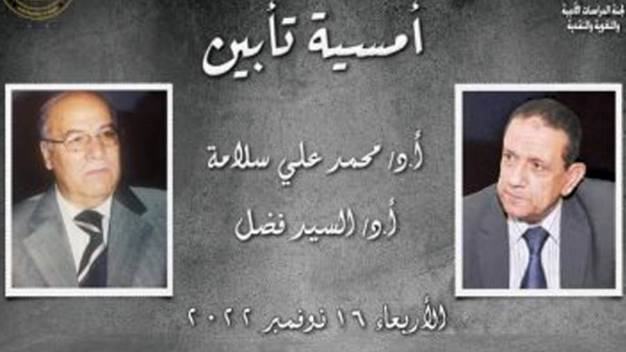 ينظم المجلس الأعلى للثقافة، لجنة الدراسات الأدبية واللغوية والنقدية، أمسية تأبين الراحلين الدكتور محمد على سلامة والدكتور السيد فضل، وذلك يوم الأربعاء 16 نوفمبر 2022 فى السادسة مساءً.