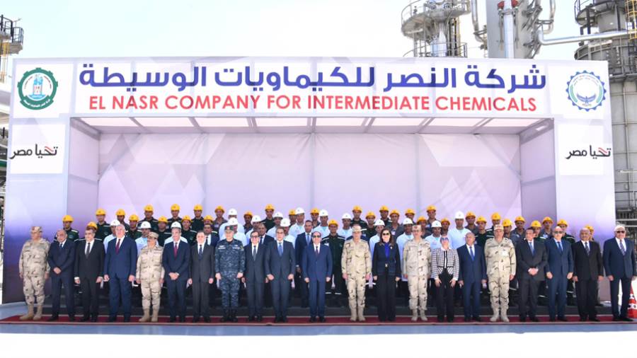 وتوسط الرئيس صورة تذكارية ضمت رئيس الوزراء الدكتور مصطفى مدبولى والفريق أول محمد زكى القائد العام للقوات المسلحة وزير الدفاع والإنتاج الحربي، ووزير البترول طارق الملا وعدد من الوزراء والمسؤولين بشركة النصر للكيماويات الوسيطة.