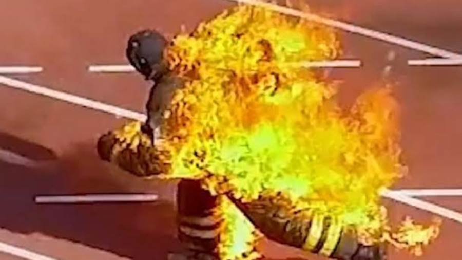 وقد ارتدى جوناثان فيرو، البالغ من العمر 39 عاما، بدلة واقية وأضرمت النيران على مضمار جرى فى هوبوردين لتحطيم الرقم القياسى لأطول مسافة لحروق الجسم بالكامل بدون أكسجين. وأكمل فيرو أول 328 قدماً فى وقت 17 ثانية، محطماً الرقم الثانى لأسرع حرق كامل للجسم مسافة 100 متر بدون أكسجين.