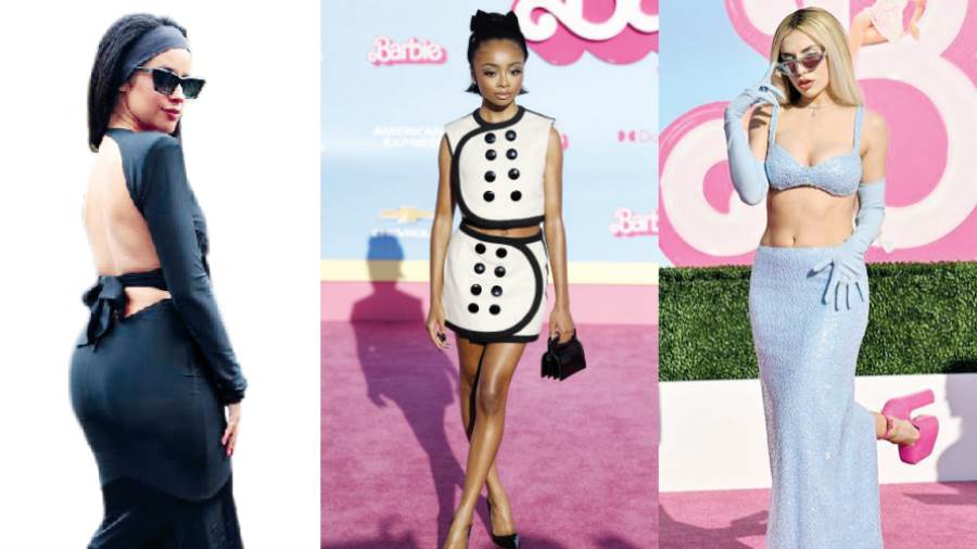 بينما ظهرت المغنية الأمريكية أفا ماكس فى العرض العالمى الأول لفيلم باربى فى لوس انجلوس بفستان من قطعتين باللون الأزرق الفاتح وقفازات طويلة بنفس لون الفستان مع ارتداء حذاء بكعب عالٍ مميز باللون الوردى الذى يميز ملابس الدمية باربي. وكذلك حضرت الممثلة الأمريكية سكاى جاكسون العرض الأول لفيلم باربى بفستان من قطعتين باللون الأسود والبنى الفاتح ومميز بأزرار كبيرة الحجم باللون الأسود. وتألقت النجمة الأمريكية داكوتا جونسون فى إيطاليا  بفستان طويل أسود اللون بلا أكمام، وأكملت إطلالتها بشعرها المنسدل الجذاب. وظهرت النجمة المغنية الأمريكية كاميلا كابيو بأسبوع الموضة بباريس بفستان أسود طويل وبأكمام طويلة ولكنه مفتوح من أعلى الظهر وحتى الخصر.