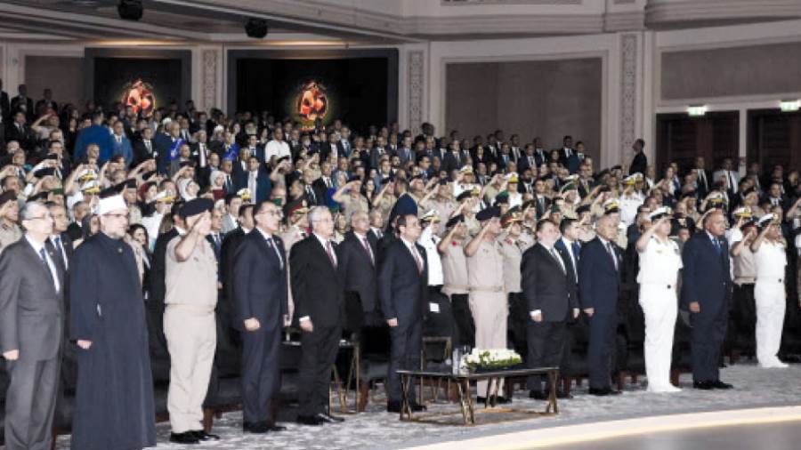 شهد الرئيس عبد الفتاح السيسى، أمس، الندوة التثقيفية رقم 38 للقوات المسلحة بمناسبة مرور 50 عامًا (اليوبيل الذهبى) لانتصار حرب أكتوبر المجيدة بمركز المنارة للمؤتمرات الدولية، التى نظمتها إدارة الشئون المعنوية للقوات المسلحة بالتعاون مع الشركة المتحدة للخدمات الإعلامية. وبدأت وقائع الندوة بتلاوة آيات من الذكر الحكيم تلاها عزف سلام الشهيد، وعقب ذلك شارك الرئيس فى تحية سلام الشهيد وعزف السلام الوطنى الجمهورى.
