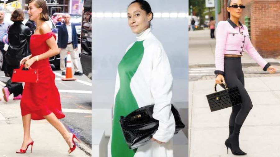 ومن بين أهم موضة موسم خريف ٢٠٢٣ الحقائب الجلدية مستطيلة الشكل والتى تتشابه مع موضة الفتاة العاملة فى ثمانينيات القرن الماضي. ارتدت عارضة الأزياء الأمريكية هايلى بيبر فستانا أحمر اللون، وحملت فى يدها حقيبة جلدية مستطيلة مميزة باللون الأحمر.