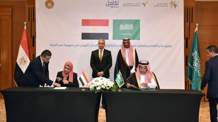 شهد حسن شحاتة وزير العمل، ونظيره السعودى أحمد الراجحى وزير الموارد البشرية والتنمية الاجتماعية، بأحد فنادق القاهرة، توقيع «مذكرة تفاهم»، و«اتفاقية الفحص المهنى»، بهدف التحقق من امتلاك العامل المصرى للمؤهلات والمهارات المطلوبة للعمل فى السعودية، وضخ عمالة مصرية ماهرة جديدة فى «سوق المملكة».