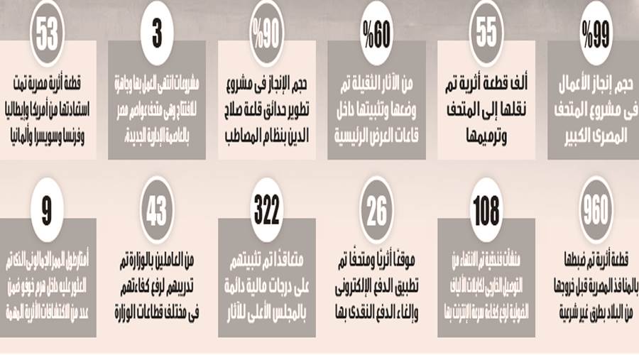 شهد عام 2023 كثيراً من الإنجازات فى الآثار، حيث تقدم العمل كثيرًا فى عدة مشاريع وانتهى العمل فى بعضها وأصبحت جاهزة للافتتاح ، بينما تم افتتاح العديد منها بالفعل، كما شهدت عدة مناطق اكتشافات أثرية جديدة، فيما تمت استعادت مصر قطعًا آثار كثيرة من الخارج، وغيرها من الإنجازات التى تلخصها الأرقام.