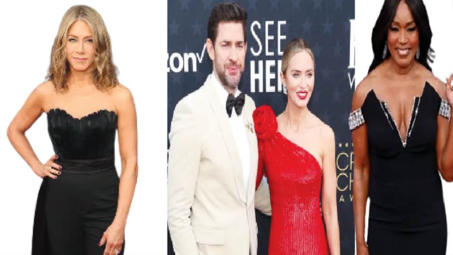 وتألقت النجمة الممثلة الأمريكية جينيفر أنيستون بفستان باللون الأسود مكون من قطعتين توب علوى بلا أكتاف، وبنطلون طويل ومزين من الخصر بحزام عريض وبه ذيل طويل.
