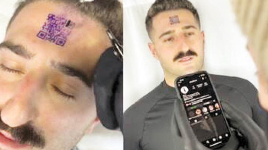 وانتشر فيديو على مواقع التواصل الاجتماعى يُظهر رجلًا يقوم بوضع وشم QR كود على جبهته لحسابه على إنستجرام، ويبدأ مقطع الفيديو برجل مستلقى على ظهره ويرسم وشمًا على جبهته، موثقًا العملية الكاملة لتشكيل الوشم، بدءًا من تحضير الحبر، ووضع الإبرة حتى رسم الرمز بالكامل على جبين الرجل، وبمجرد اكتماله يوضح الفنان كيفية عمل الوشم، فى غضون ساعات قليلة من مشاركته جمع 1.7 مليون مشاهدة.
