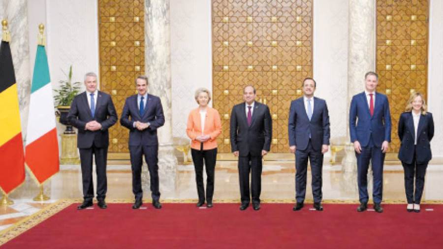 رحب الرئيس عبد الفتاح السيسي، فى كلمته خلال الاجتماع السداسي، بالقادة الأوروبيين، «أورسولا فون دير لاين»، رئيسة المفوضية الأوروبية، وألكسندر دى كروو»، رئيس الوزراء البلجيكى رئيس الاتحاد الأوروبي، و«كيرياكوس ميتسوتاكيس»، رئيس وزراء اليونان، والمستشار النمساوى «كارل نيهامر»، والرئيس القبرصى «نيكوس خريستودوليدس»، ورئيسة الوزراء الإيطالية «جورجيا ميلوني».