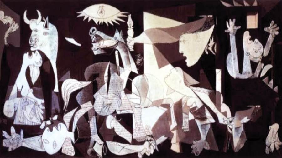 لعل لوحة «جورنيكا» أشهر لوحة تعبر عن مأساة الحروب والتى أبدعها «بابلو بيكاسو» مؤسس المدرسة التكعيبية بعد تعاطفه المر لقصف المدينة خلال الحرب الأهلية الإسبانية - دولته الأم - وتعتبر هذه اللوحة رمزًا أيقونيًا لمأساة الحرب ومعاناة المدنيين.