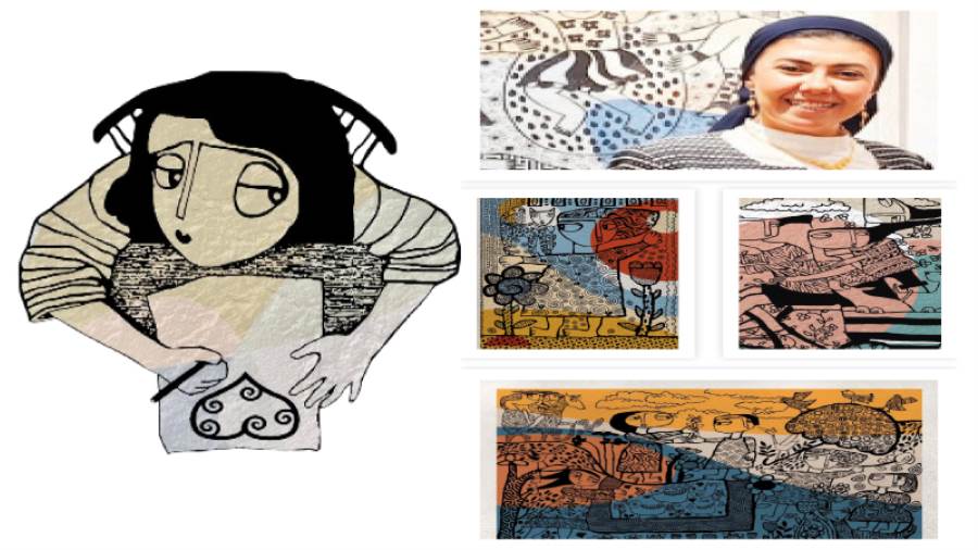 لوحات المعرض منفذة بطريقة الحفر الطباعى - على ورق بملمس بارز يثرى اللوحة ويزيده ثقلًا، وباليتة ألوان ناعمة لتكون مع مفردات اللوحات زخمًا ورونقًا.