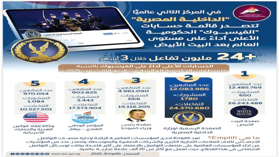 نجحت الصفحة الرسمية لوزارة الداخلية على موقع التواصل الاجتماعى «فيسبوك» فى حصد المركز الثانى عالميًا فى قائمة حسابات «فيسبوك» الحكومية الأعلى أداء على مستوى العالم، حيث كشفت مؤسسة Emplifi المتخصصة فى إصدار المؤشرات عن المؤسسات العالمية بالاعتماد على أكبر قاعدة بيانات للحسابات الحكومية الأعلى أداء فى الربع الثالث من 2025، أن صفحة الداخلية المصرية جاءت فى المركز الثانى بعد البيت الأبيض، خاصة أن الحساب شهد ما يزيد على 24 مليون تفاعل خلال 3 أشهر.