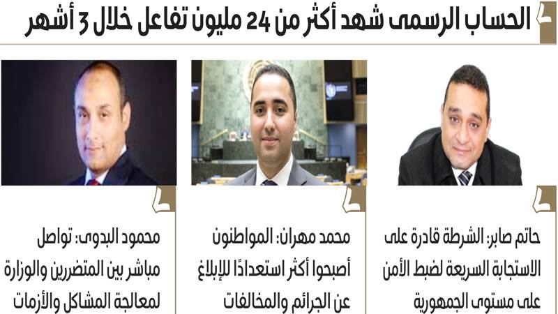 واستطرد: إن القوة هنا ليست بكثرة عدد المتابعين، لكن فى كونها جزءًا من نبض الشارع، وهذا ما أكسبها قوة وثقة، ناهيك عن أن إدارة الملف بهذه الطريقة جعلت الأهالى يرون نموذجًا مختلفًا، فأصبح الأمن قريبًا، والوصول والتواصل والانتشار والتحرك وتقديم معلومة دقيقة أمرًا سهلًا، باختصار هناك عمل جاد على مدار الـ 24 ساعة لخدمة المواطن، وهذا كله يرفع مستوى الأمن ويقلل الفجوة بين المواطن والجهة الرسمية، ويعد المكسب الأهم.