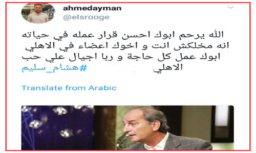 وغرد آخر فى تويتة له قائلا: «الله يرحم أبوك أحسن قرار عمله فى حياته أنه مخلكش أنت وأخوك أعضاء فى الأهلي.. أبوك عمل كل حاجة وربى أجيال على حب الأهلى.. هشام سليم».