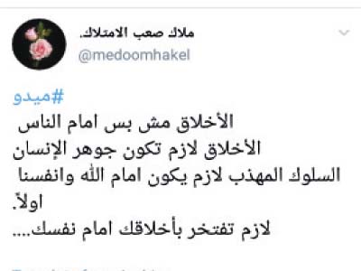 غرد أحد رواد تويترقائلًا: الأخلاق مش بس أمام الناس، الأخلاق لازم تكون جوهر الإنسان، السلوك المهذب لازم يكون أمام الله وأنفسنا، لازم تفتخر بأخلاقك أمام نفسك.