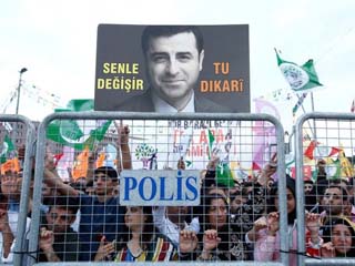 وفى تحد لديكتاتورية الرئيس التركى، ومن خلف القضبان، دعا صلاح الدين دميرتاش المرشح للانتخابات الرئاسية التركية، والسياسى الكردى البارز المسجون بتهمة المشاركة فى أنشطة «إرهابية»، الأحد، فى خطاب متلفز، الناخبين لمنع سقوط البلاد فى «حافة الهاوية» من خلال مشاركتهم فى الاقتراع الذى يجرى فى 24 يونيو، واصفا نظام أردوغان بـ«القمعى».