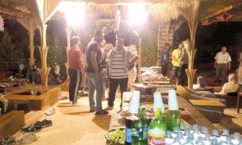 الحفاوة فى الاستقبال وكرم الضيافة، من قبل بدو سانت كاترين خلال حفلات السمر التى يحرص على حضورها السائحين من جميع دول العالم، بموائد يقدمونها وصوان ممتلئة بأصناف مختلفة من اللحم المجبى والمحمر والمشوى والمطبوخ.