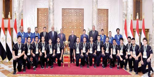 بعد رفعهم اسم مصر عاليًا عقب فوزهم بكأس العالم للناشئين لكرة اليد، استقبل الرئيس عبدالفتاح السيسي، أمس، لاعبى وأعضاء الجهاز الفنى للمنتخب الوطنى للناشئين، المتوج ببطولة كأس العالم للناشئين فى كرة اليد، حيث قام الرئيس بمنحهم وسام الرياضة من الطبقة الأولى.