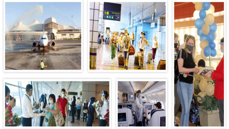 فى أول أيام عودة حركة السياحة الوافدة إلى مصربعد توقف دام قرابة الثلاثة أشهر بسبب جائحة «كورونا»، استقبلت مدينتا الغردقة وشرم الشيخ أمس طائرتين قادمتين من العاصمة الأوكرانية «كييف»، حيث بلغ عدد الركاب فى الطائرة التى استقبلتها مدينة الغردقة ١٧٣ سائحا، وطائرة مدينة شرم الشيخ ١٢٤ سائحا، وقد قامت المكاتب الداخلية لوزارة السياحة والهيئة المصرية العامة للتنشيط السياحى بالمحافظتين باستقبال الركاب بالورود وقدموا لهم بعض الهدايا التذكارية.
