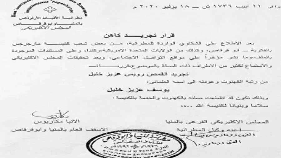 أصدر قداسة البابا تواضروس الثانى بابا الإسكندرية وبطريرك الكرازة المرقسية قرارا باباويا يحمل رقم 6 لسنة 2020 يعلن فيه تجريد القمص رويس عزيز خليل الكاهن بالمنيا وأبو قرقاص، وذلك بعد التحقيق فى الشكاوى التى وردت ضده وما نشر على صفحات التواصل الاجتماعى، وتمت إعادته لاسمه العلمانى يوسف عزيز خليل.