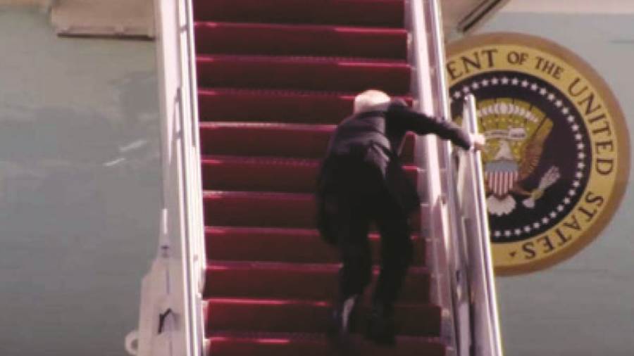 وأظهر مقطع فيديو سقوط الرئيس الأمريكى، 3 مرات متتالية، أثناء صعوده درجات السلم المؤدى إلى طائرة «إير فورس ون»، الجمعة الماضية، المتجهة إلى أتلانتا من جوينت بيس أندروز فى ماريلاند.