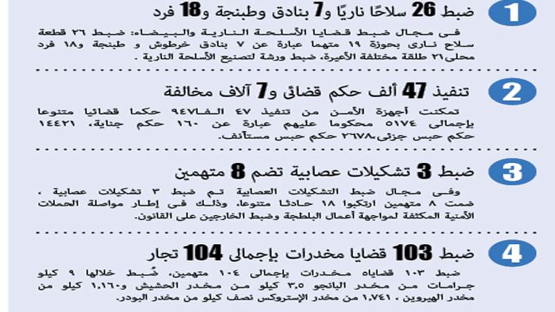فى إطار مواصلة الحملات الأمنية المكثفة لمواجهة أعمال البلطجة وضبط الخارجين على القانون وحائزى الأسلحة النارية والبيضاء وإحكام السيطرة الأمنية ، تمكنت أجهزة وزارة الداخلية بمختلف مديريات الأمن على مستوى الجمهورية من توجيه حملة أمنية مكبرة أسفرت جهودها خلال 24 ساعة عن ضبط :-