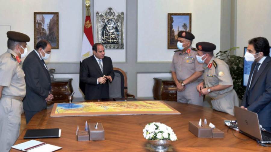 اجتمع الرئيس عبدالفتاح السيسى، أمس، مع اللواء أمير سيد أحمد مستشار رئيس الجمهورية للتخطيط العمراني، واللواء أ.ح إيهاب الفار رئيس الهيئة الهندسية للقوات المسلحة، واللواء أشرف العربى رئيس المكتب الاستشارى للهيئة الهندسية، والعميد عبد العزيز الفقى مساعد رئيس الهيئة الهندسية لتصميمات الطرق، حيث قال السفير بسام راضي، المتحدث الرسمى باسم رئاسة الجمهورية، إن الاجتماع تناول متابعة الموقف الإنشائى والهندسى لعدد من مشروعات الهيئة الهندسية على مستوى الجمهورية، خاصةً مدينة الجلالة والعاصمة الإدارية الجديدة وما تضمه من أحياء سكنية ومنشآت، وفى مقدمتها التصميمات الهندسية لساحة الشعب، والمدارس الدولية المختلفة، ومدينة مرابط للخيول التى ستمثل جزءاً رئيسياً من مدينة مصر الدولية للألعاب الأوليمبية، فضلاً عن المقر الجديد للبورصة.
